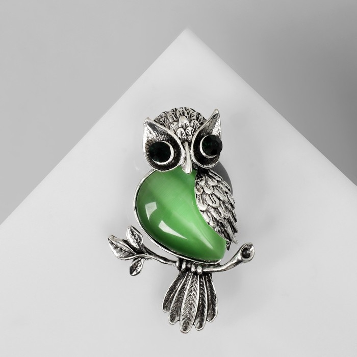 Брошь «Сова», цвет зелёный в чернёном серебре