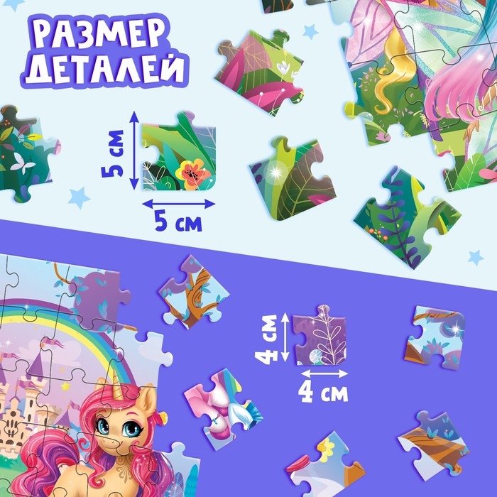 - Ребёнок соберёт 2 пазла с разным количеством деталей и украсит их декором из набора.