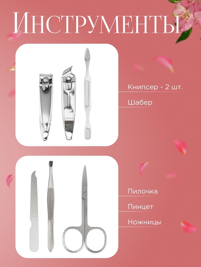 Комплект принадлежностей для маникюра пригодится дома, на работе и во время путешествий. В любых обстоятельствах эти инструменты помогут сохранить привлекательный внешний вид ваших рук.