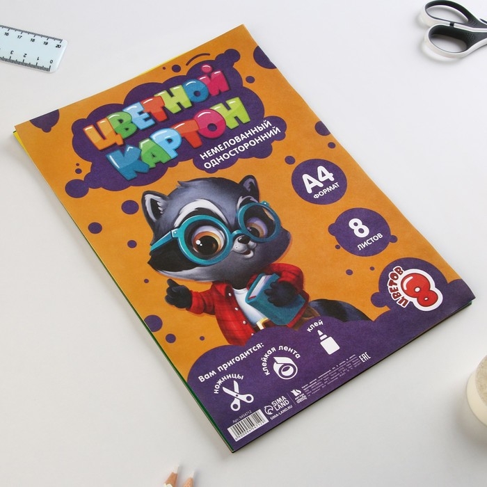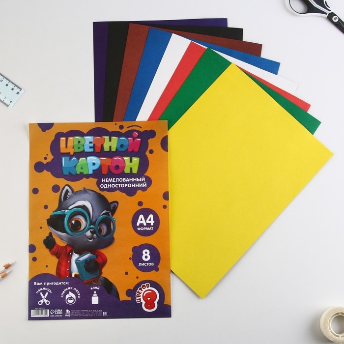 Картон цветной А4, 8 листов 8 цветов немелованный односторонний «1 сентября:Умный енотик»