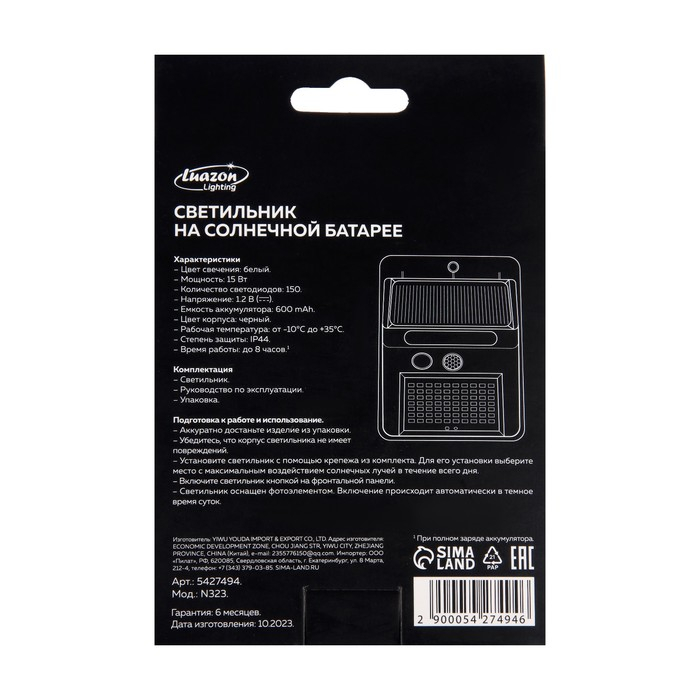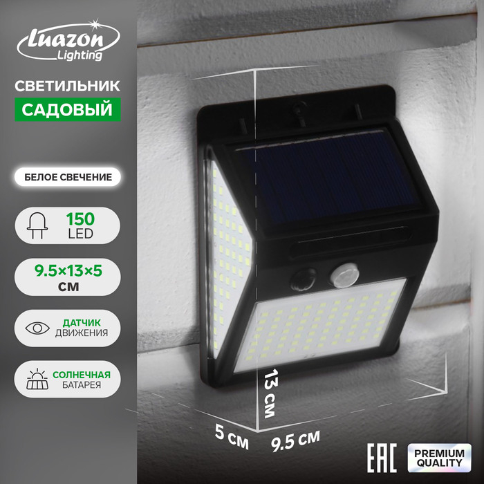 Садовый светильник на солнечной батарее с датчиком движения, накладной, 9.5 × 13 × 5 см, 150 LED, свечение белое