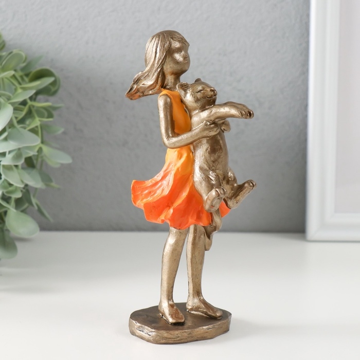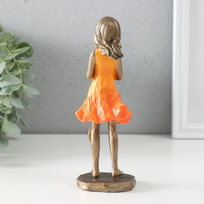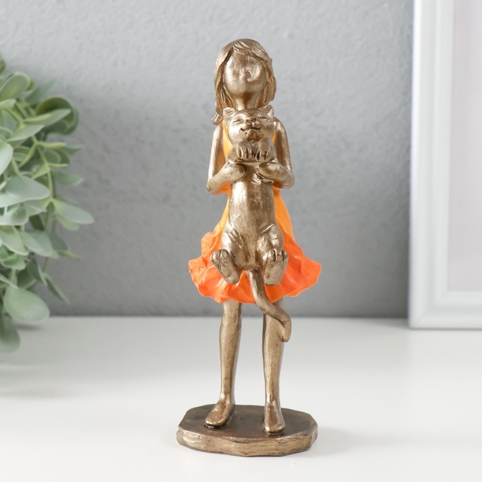 Сувенир полистоун "Малышка в оранжевом платье с котом" бронза 7,5х6х16 см