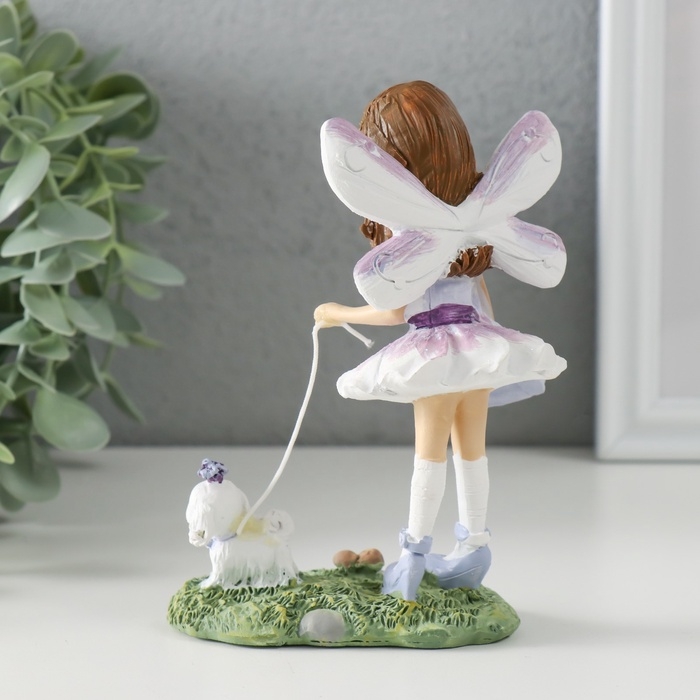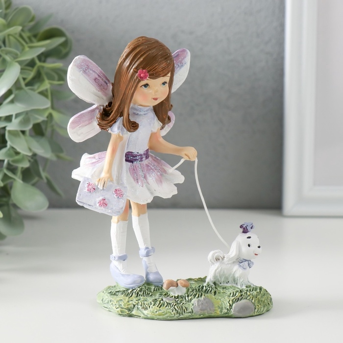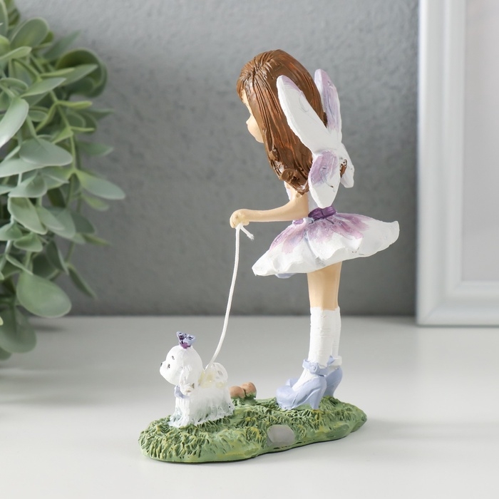 Сувенир полистоун "Малышка в сиреневом платье с крыльями, выгуливает собачку" 10х7х13 см