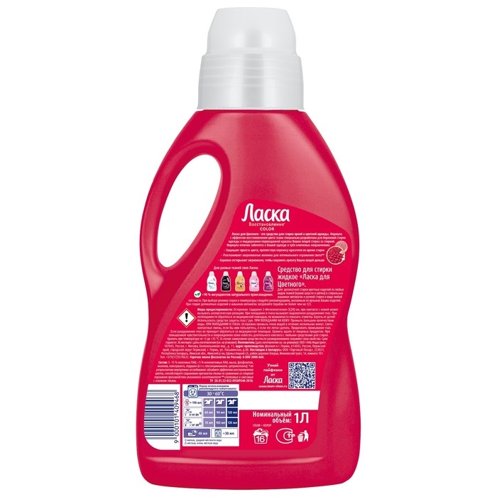 Жидкий порошок Ласка Восстановление COLOR для цветного эффективно и бережно отстирывает загрязнения на одежде, восстанавливая яркость цвета и сохраняя прочность волокон ткани. В отличие от обычного стирального порошка, Ласка содержит цветозащитные ингредиенты, которые поддерживают стойкость цвета одежды. Активные компоненты способствуют уменьшению количества катышков на ткани. Формула содержит более 90% ингредиентов натурального происхождения.