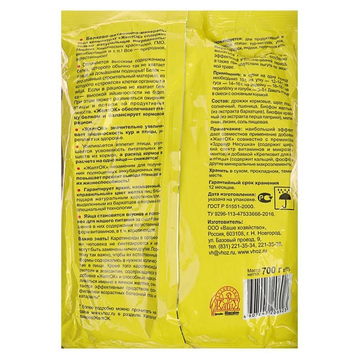 Желток «Ваше хозяйство» обеспечивает птицу белком и балансирует кормовой рацион, чтобы была высокая яйценосность и не развивалось ожирение.