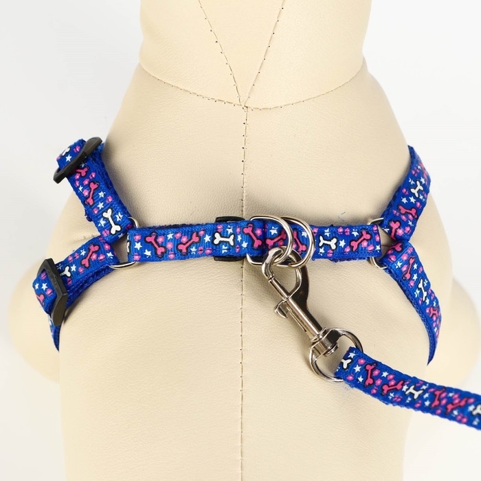 Комплект "Звёздные косточки", ширина 1 см, поводок 120 см, шлейка 23-35 см, синий