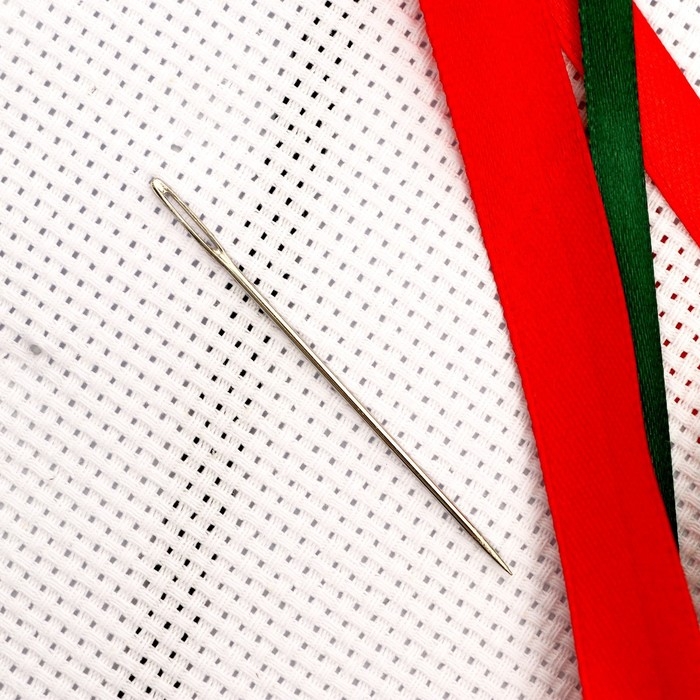 - Для закрепления ленты выведите её на изнаночную сторону и проденьте иглу под стежками вышивки.