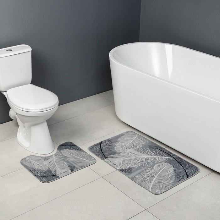 Набор ковриков для ванной и туалета Доляна «Пёрышки», 2 шт, 50×80 см, 40×50 см, цвет серый