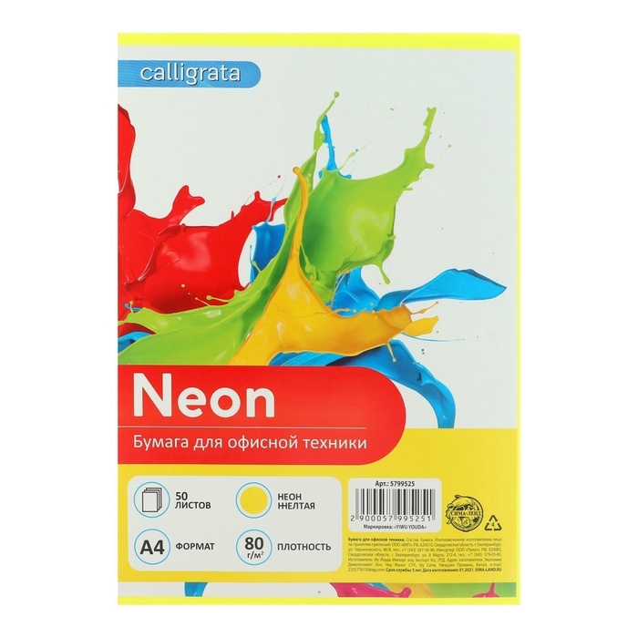 Бумага цветная А4, 50 листов, НЕОН жёлтая, плотность 80г/м2