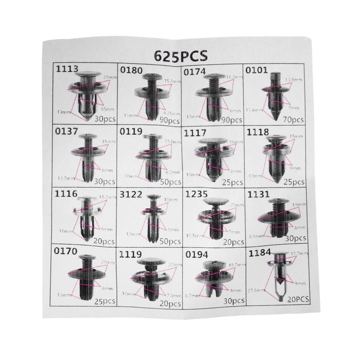 Клипсы и пистоны крепежные, 16 видов, набор 625 шт