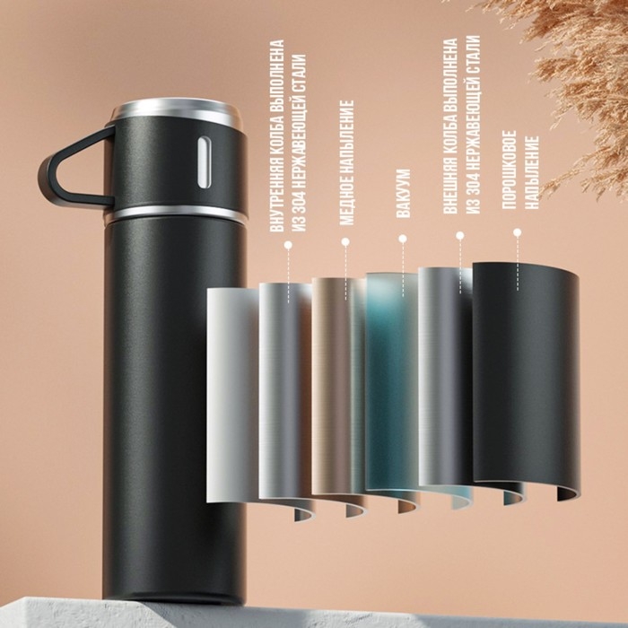Набор "Мастер К": термос 500 мл и 3 кружки 160 мл, сохраняет тепло 12 ч, черный
