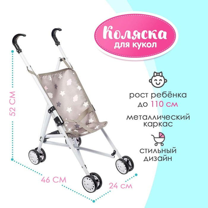 - Размер коляски: 53 × 29 × 55 см. Подходит для детей ростом до 110 см.