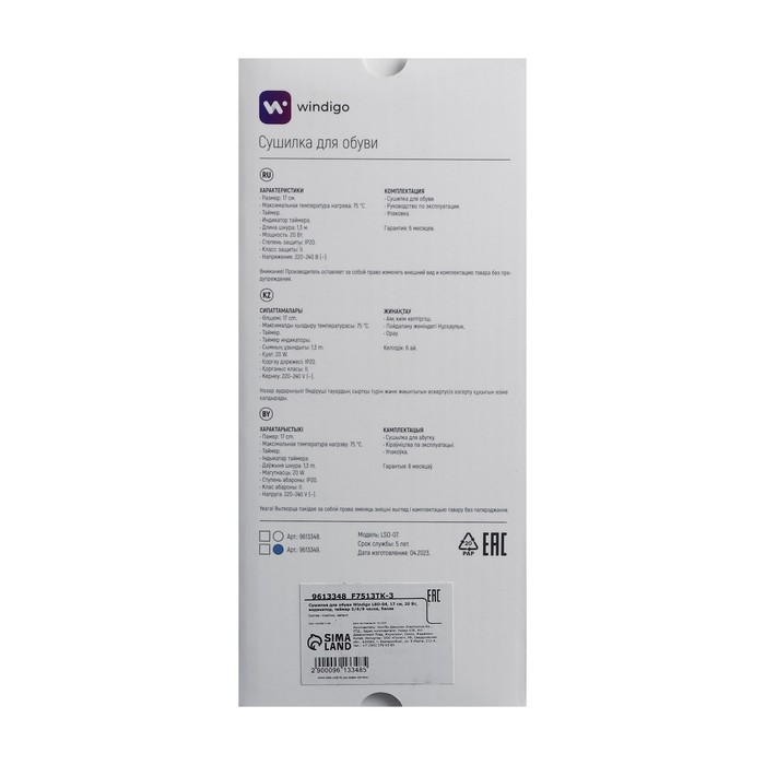 Сушилка для обуви Windigo LSO-07, 17 см, 20 Вт, индикатор, таймер 3/6/9 часов, белая