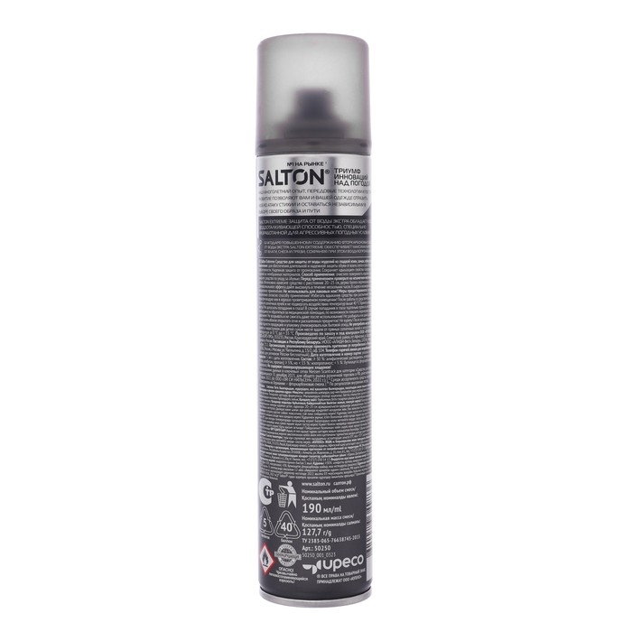 Водоотталкивающая пропитка Salton Extreme - это инновационное средство, которое обеспечивает надежную защиту одежды и обуви от воды и влаги. Этот продукт представляет собой аэрозоль объемом 190 мл, который легко наносится на поверхность и быстро высыхает.