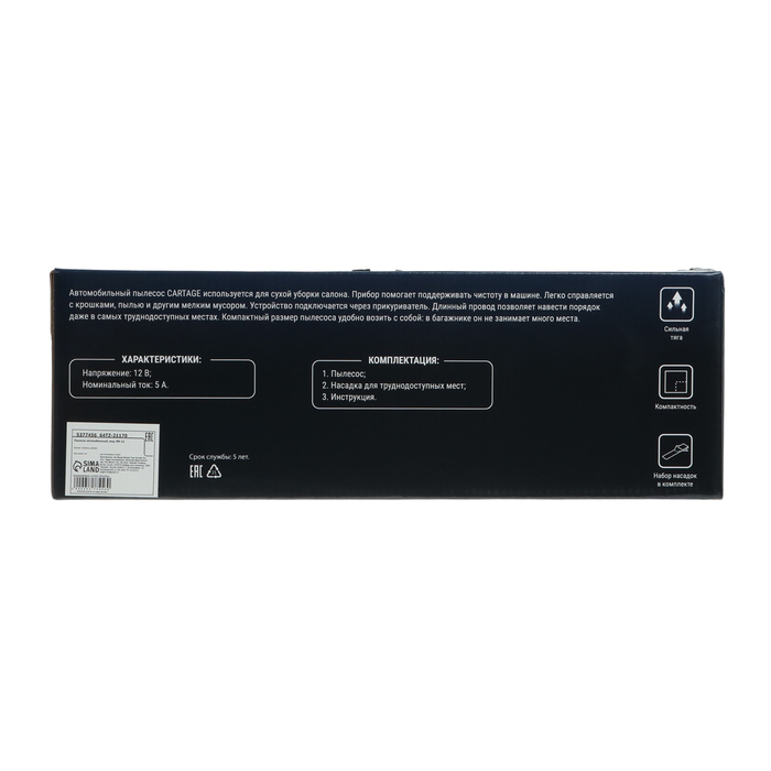 Пылесос автомобильный CARTAGE идеален для уборки салона автомобиля. Мощность 120 Вт и 3 универсальных насадок позволяют собрать пыль, песок, пепел даже из самых труднодоступных мест салона. Питание от бортовой электросети легкового автомобиля 12 В позволяет пользоваться пылесосом в любом удобном для вас месте. Компактный размер позволяет хранить пылесос в багажнике автомобиля.