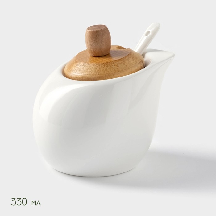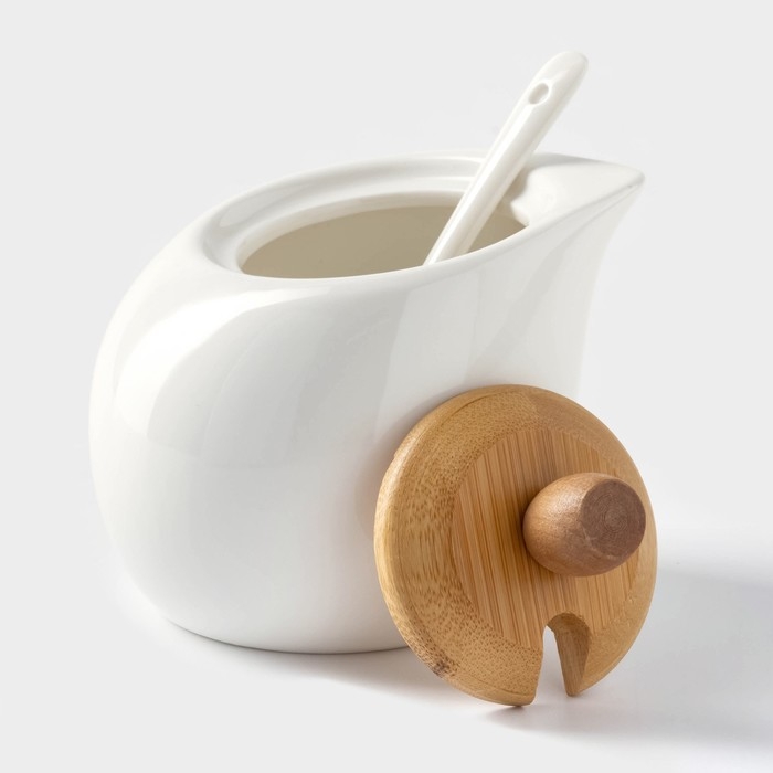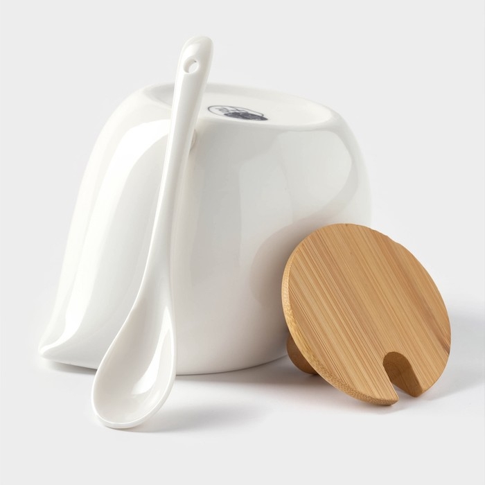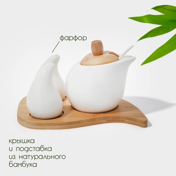 Набор фарфоровый для специй на бамбуковой подставке BellaTenero «Капельки», 3 предмета: солонка 60 мл, перечница 60 мл, сахарница с ложкой 330 мл, цвет белый