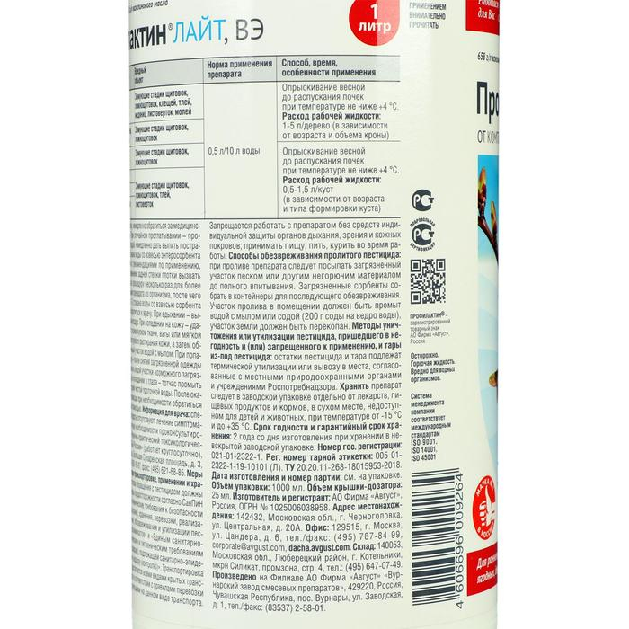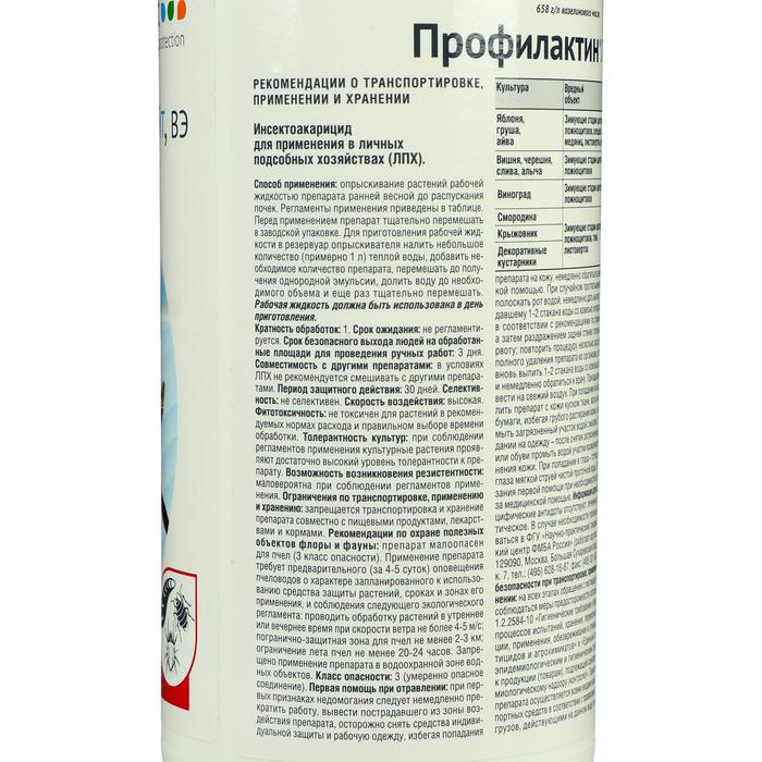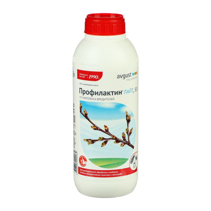 Средство защиты растений от вредителей «Профилактин Лайт» эффективно против насекомых и клещей в зимующей стадии. Является инсектоакарицидом. Допускается к использованию в личном подсобном хозяйстве, подходит для применения в экологическом земледелии. Можно обрабатывать плодовые деревья, ягодные и декоративные культуры, а также виноград.
