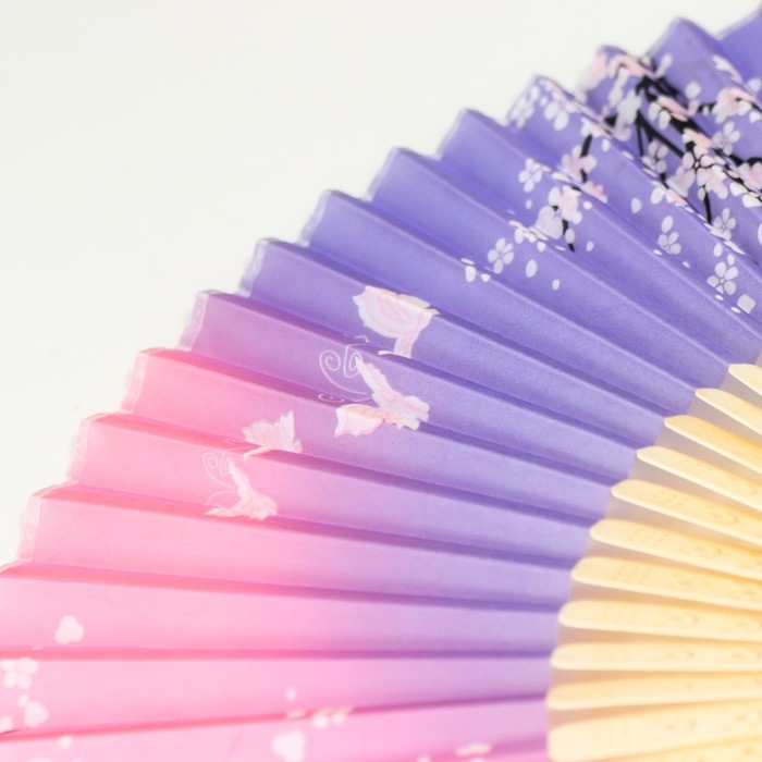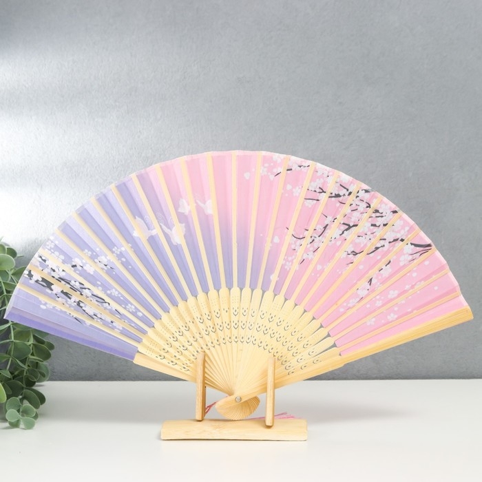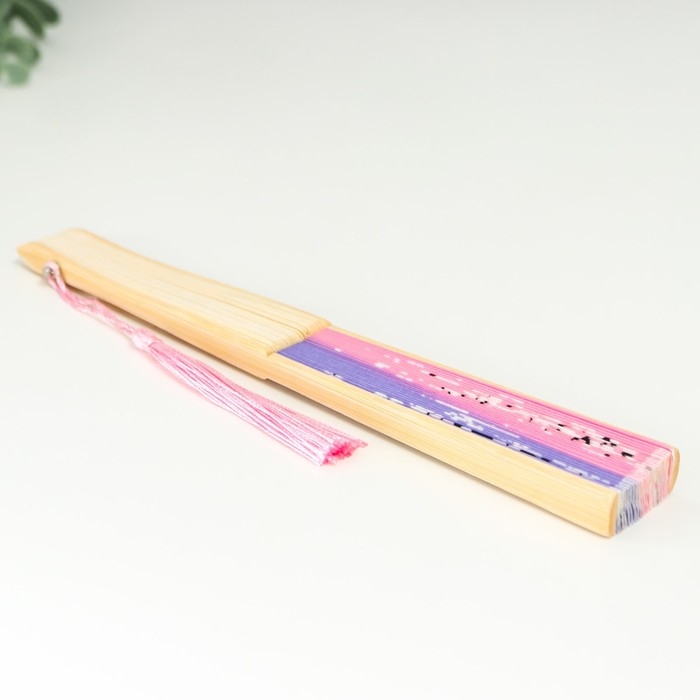 Веер бамбук, текстиль h=21 см "Бабочки в сакуре" сиренево-розовый, с кисточкой