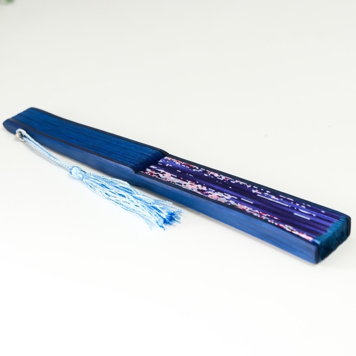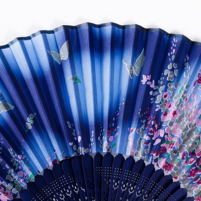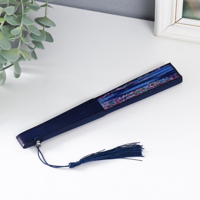 Веер бамбук, текстиль h=21 см "Цветы и бабочки" синий, с кисточкой