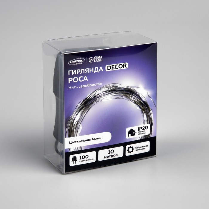 Гирлянда «Нить» 10 м роса, IP20, серебристая нить, 100 LED, свечение белое, 12 В