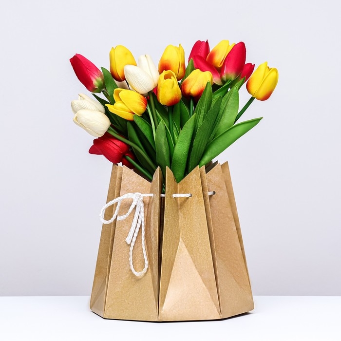 - Букет в такой упаковке сохраняет вертикальное положение, поэтому его удобно устроить в салоне автомобиля, а в помещении он может стоять на столе без вазы.