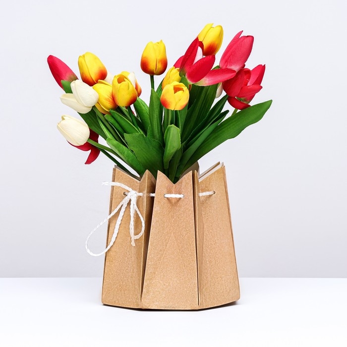 - Букет в такой упаковке сохраняет вертикальное положение, поэтому его удобно устроить в салоне автомобиля, а в помещении он может стоять на столе без вазы.