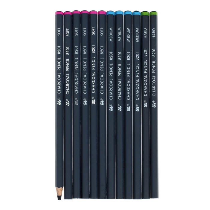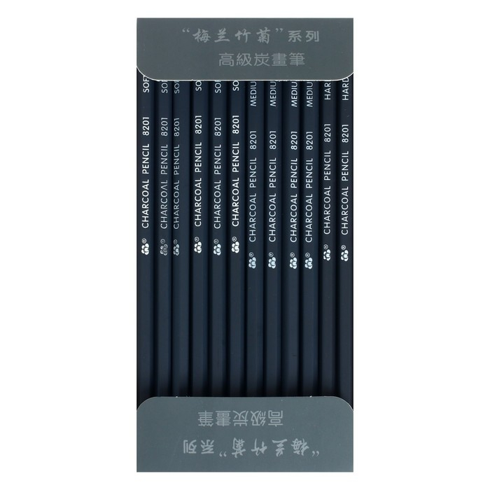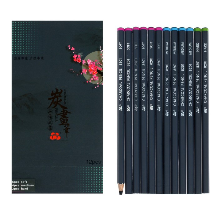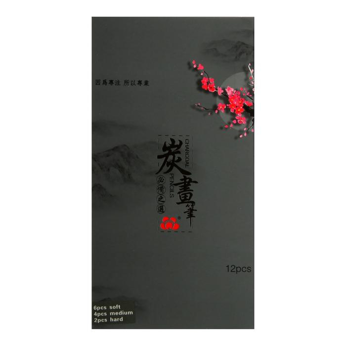 Карандаши угольные черные 12 штук в наборе (6 шт-мягкий,4 шт-средний,2 шт-твердый)