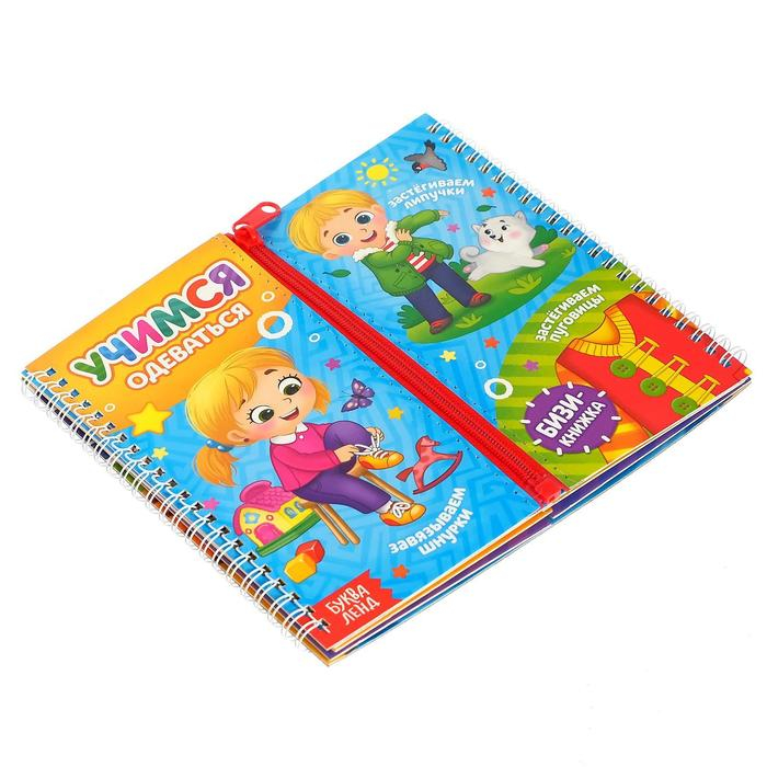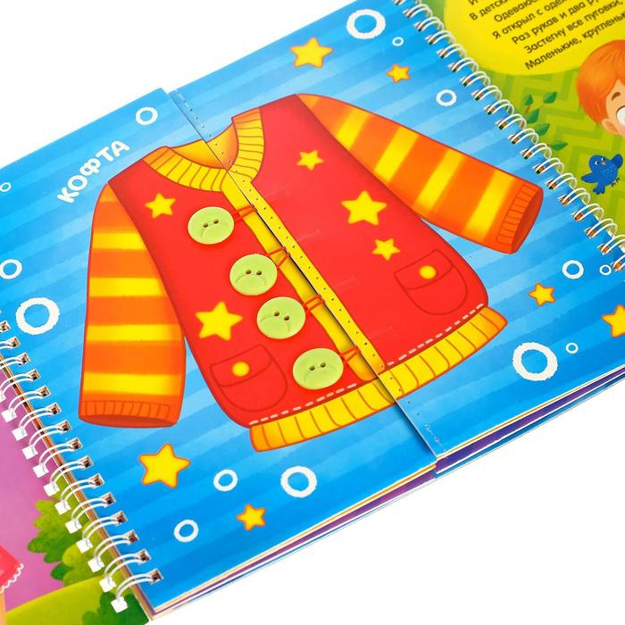 С яркой и интересной бизикнижкой малыш узнает, как одеваются в разное время года и научится застёгивать и расстёгивать пуговицы, шнурки, липучки, кнопки и молнию.