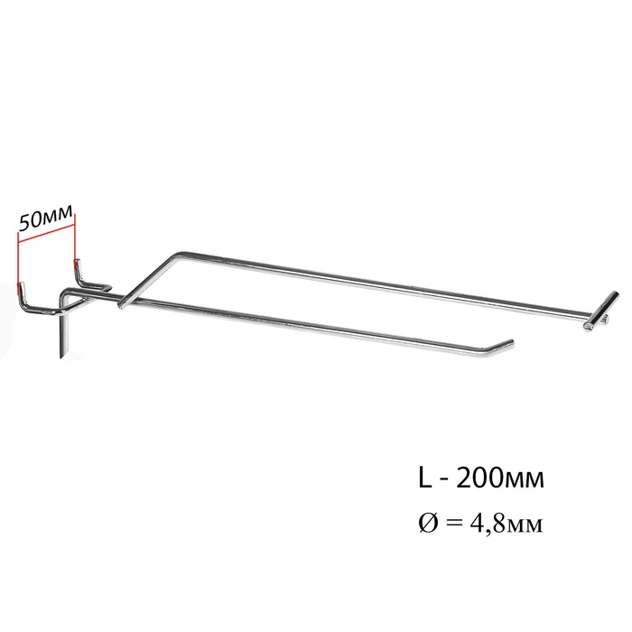 Крючок одинарный с ценникодержателем для металлической перфорированной панели, d=4,8 мм,L=20 см, шаг 50 мм, цвет хром
