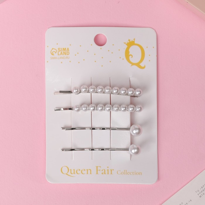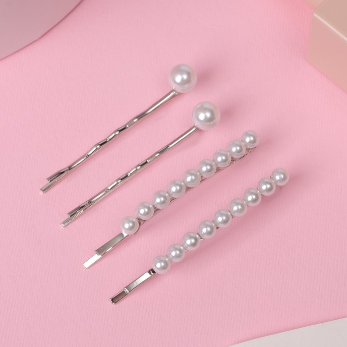 Невидимка для волос "Морская пена" (набор 4 шт) бусины, 5 см и 5,5 см, серебристо-белый