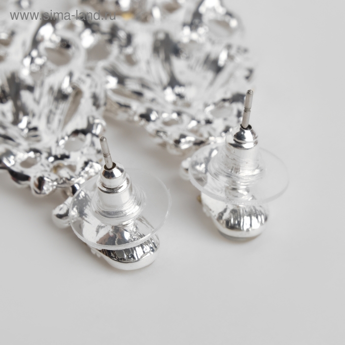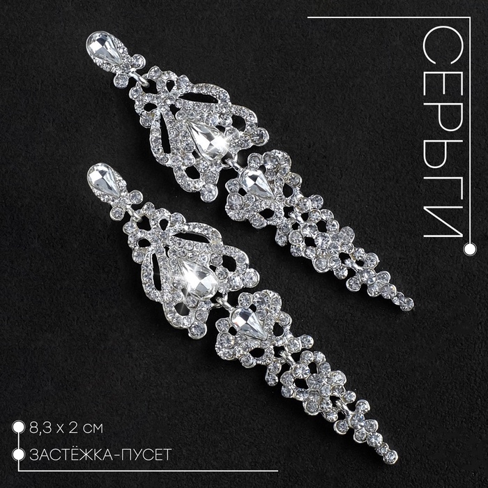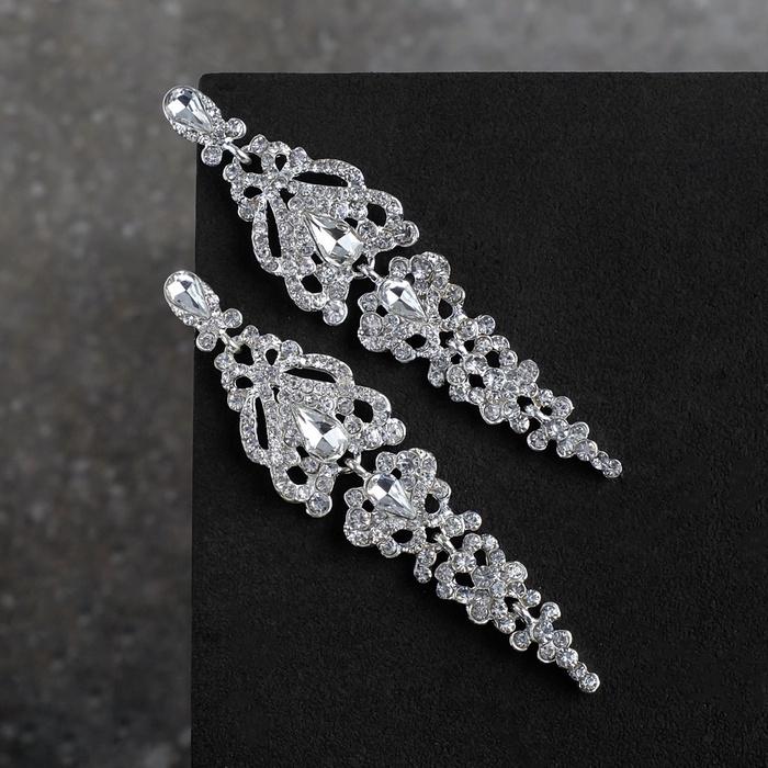 Серьги висячие со стразами «Ажур» лёд, цвет белый в серебре, 8,3 см