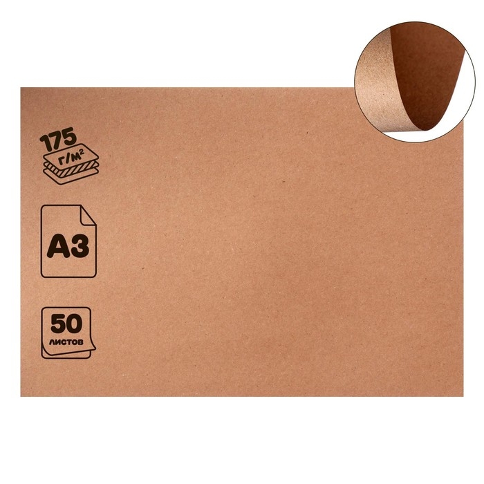 Упаковка содержит 50 листов из крафт-бумаги формата А3 (297 х 420 мм). Листы высокой плотности 175 г/м2 устойчивы к истиранию и обеспечивают чистую реалистичную передачу цвета. Выполнены в коричневом цвете. Упаковка - пакет.
