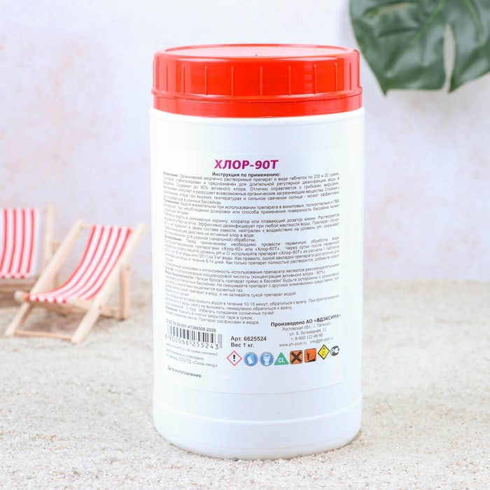 Дозирование: перед применением необходимо провести первичную обработку воды быстрорастворимыми препаратами «Хлор-60» и «Хлор-60Т». Через сутки после первичной обработки отрегулируйте уровень рН и Сl — используйте препарат «Хлор-90Т» из расчёта 1 таблетка (20 г) на 3 м³ воды. Как правило, одной закладки препарата достаточно для дезинфекции воды в течение 8–14 дней. Когда препарат полностью растворится, добавьте новую порцию.
