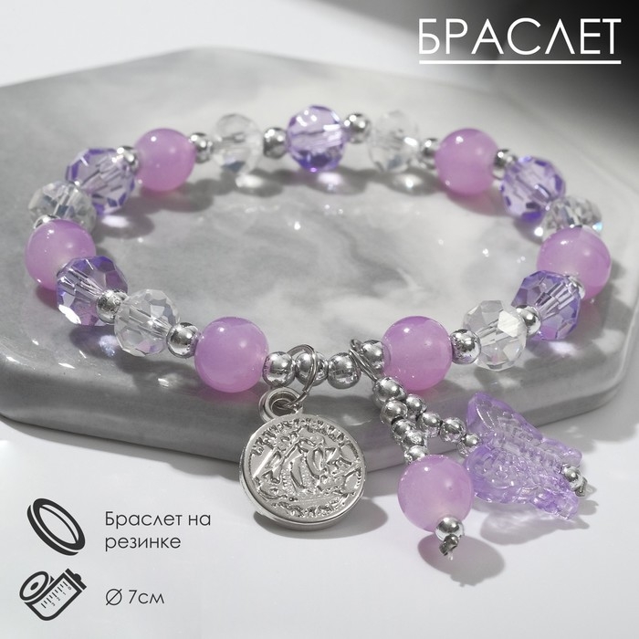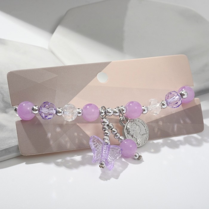 Браслет «Радость» монетка и бабочки, цвет бело-сиреневый в серебре, d=7 см