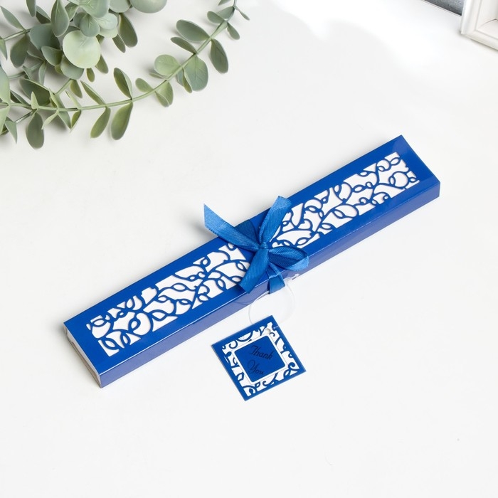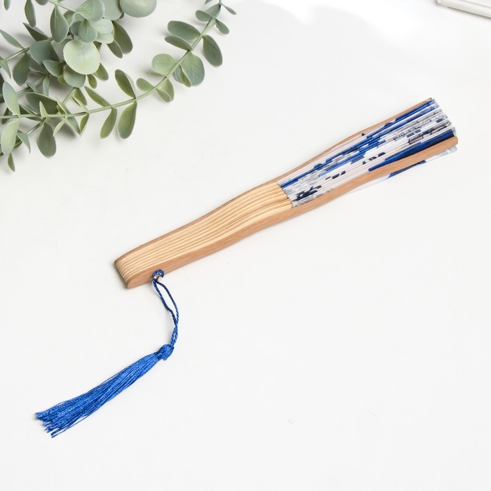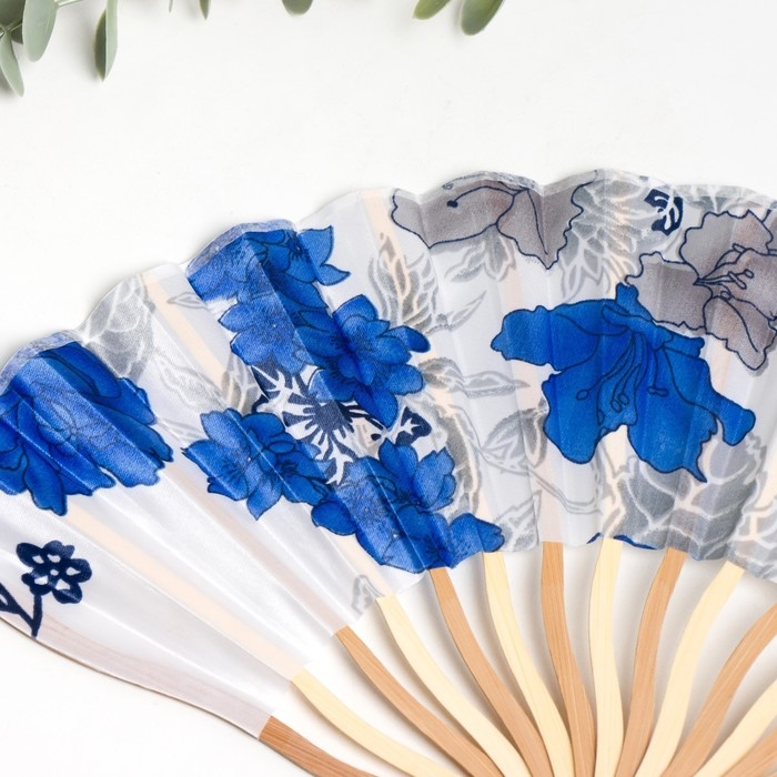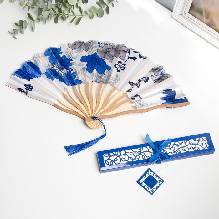 Веер бамбук, текстиль h=21 см изгиб, с кистью "Цветы" в коробке, бело-синий