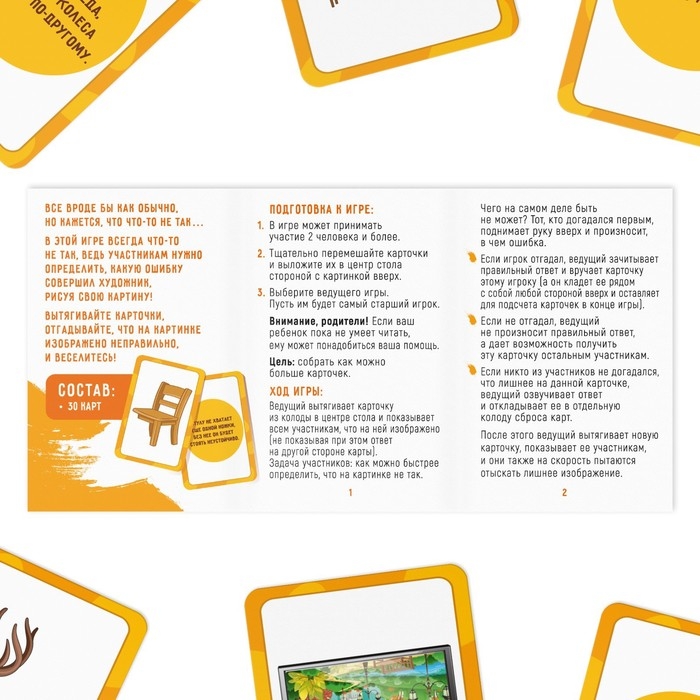 Главная задача всех участников — внимательно посмотреть на картинку и сказать, что же там не так. Тот, кто ответит первым, получит карточку. А победит тот, кто наберёт больше всего карт!