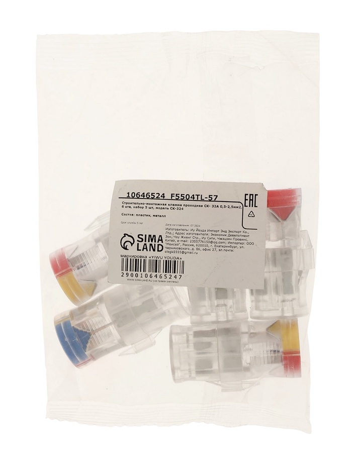 Строительно-монтажная клемма проходная СК-324 32А 0,5-2,5мм2, 6 отв, набор 5 шт