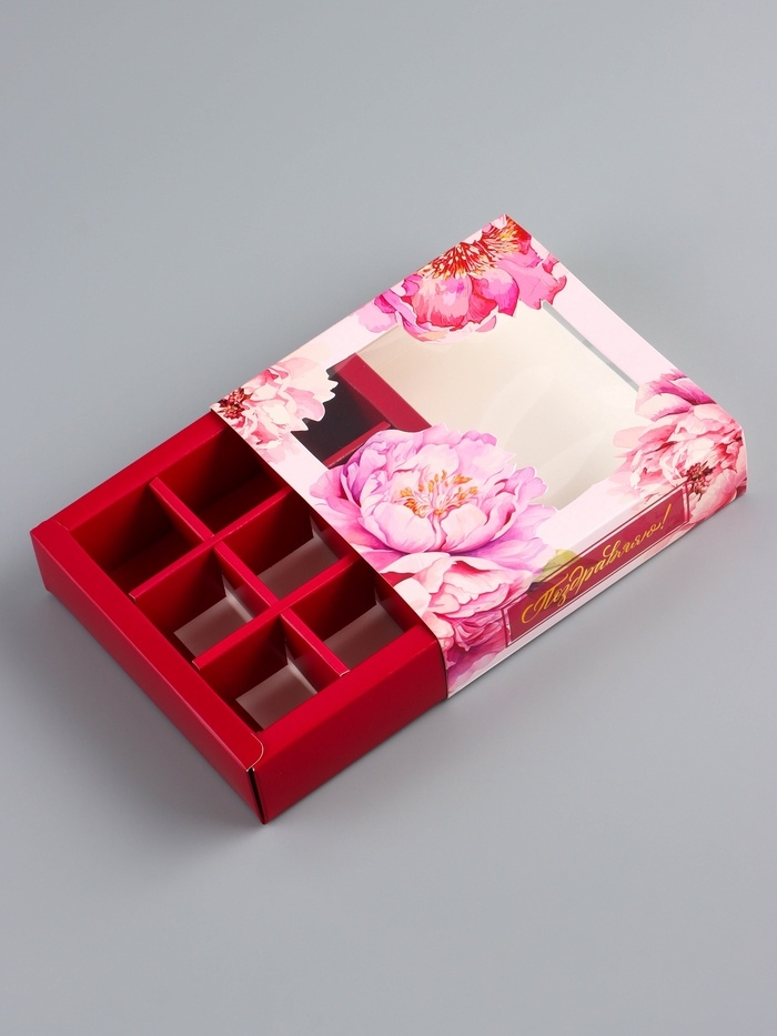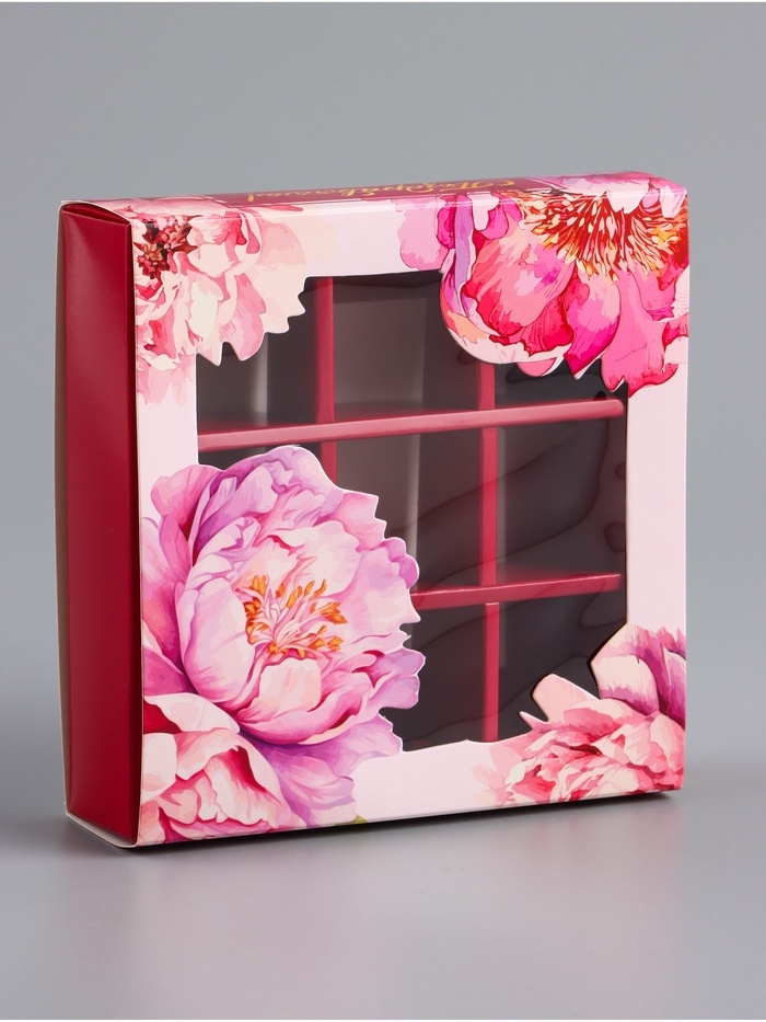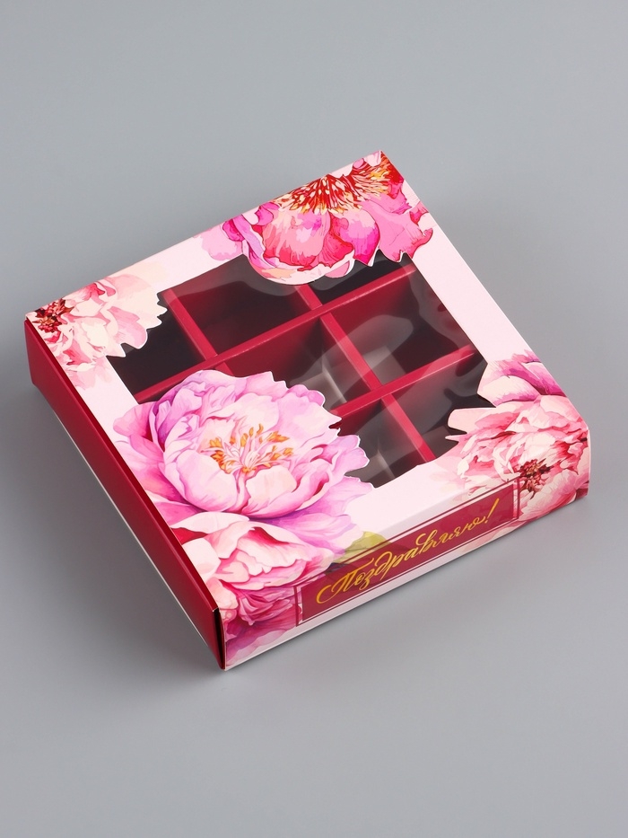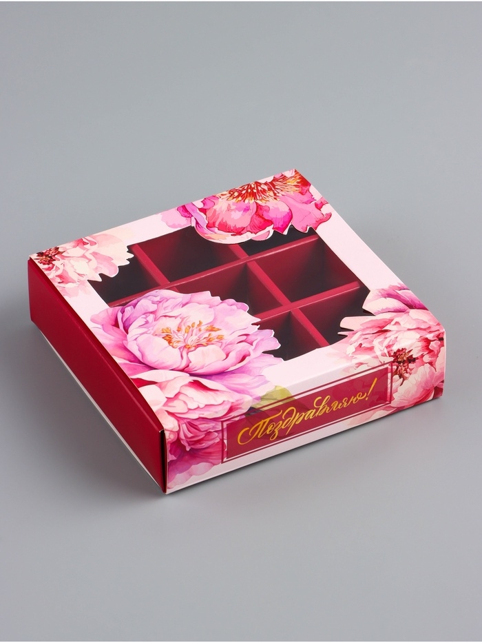 Коробка для конфет с обечайкой 9 шт "Поздравляю", 13,7 х 13,7 х 3,5 см. Кондитерская упаковка
