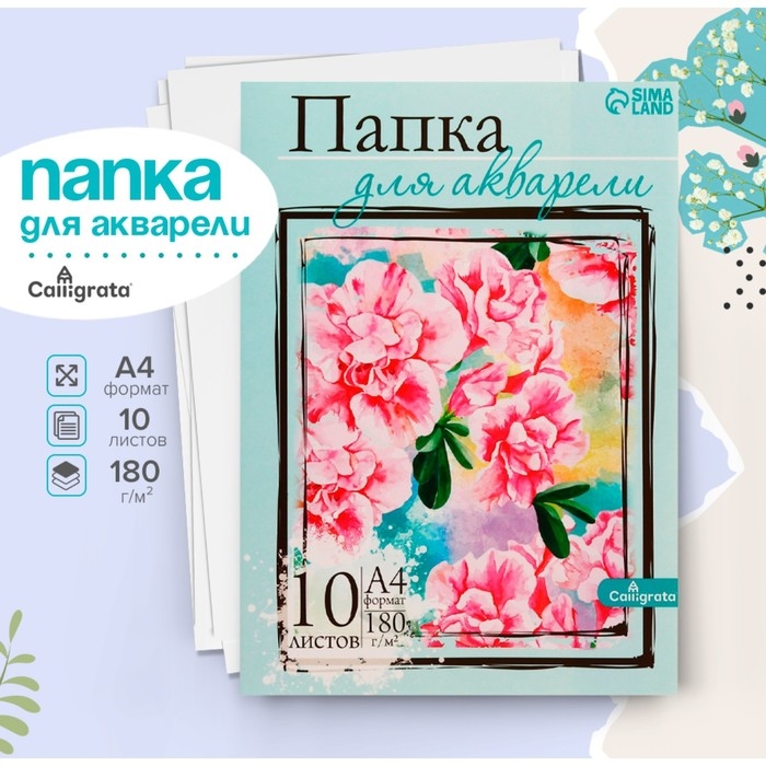 Папка для акварели А4, 10 листов "Цветы", блок 180 г/м2, рисовальная