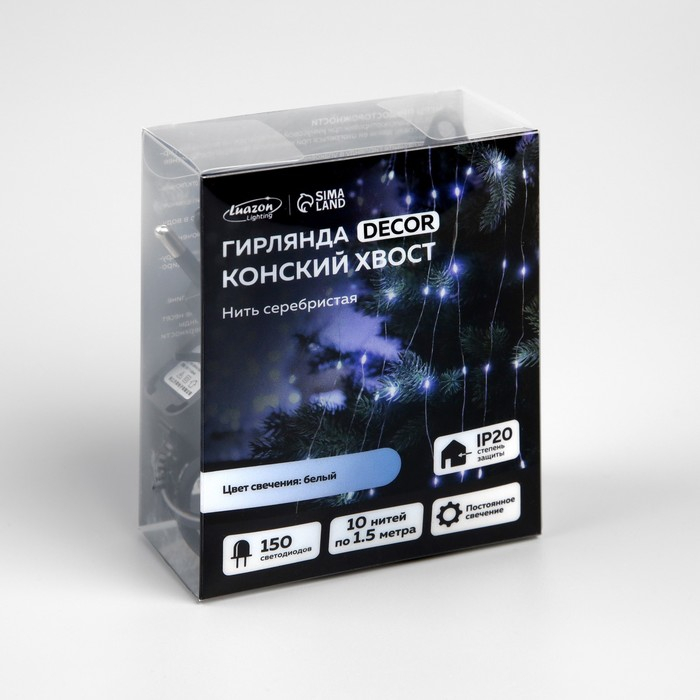 Гирлянда «Конский хвост» 10 нитей по 1.5 м, IP20, серебристая нить, 150 LED, свечение белое, 12 В