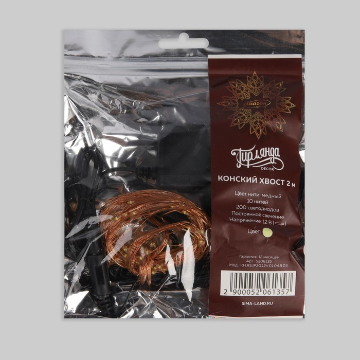 Гирлянда «Конский хвост» 10 нитей по 2 м, IP20, медная нить, 200 LED, свечение тёплое белое, 12 В