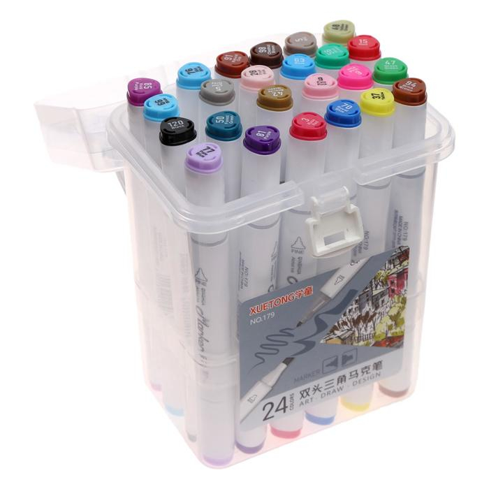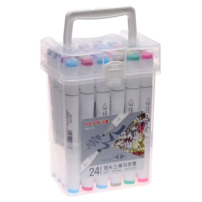 Набор маркеров профессиональных двусторонних 24 цветов, в пенале, c ручкой , микс