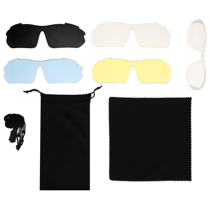 Велосипедные солнцезащитные очки оснащены пятью сменными небьющимися линзами для обеспечения оптической чёткости днём или ночью. В комплект входит чехол из микроволокна и футляр на молнии с внешними отделениями для хранения сменных линз.