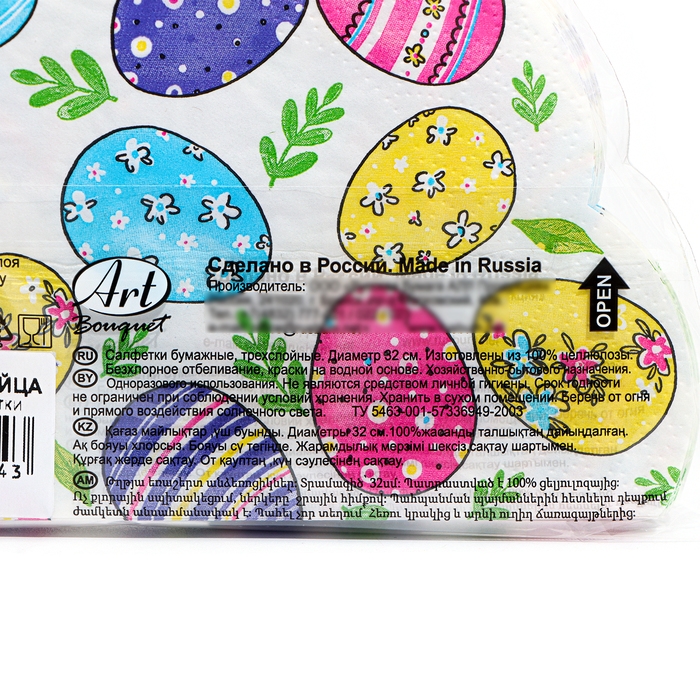 Салфетка состоит из 100% целлюлозы. Диаметр салфетки в развёрнутом виде 32 см.