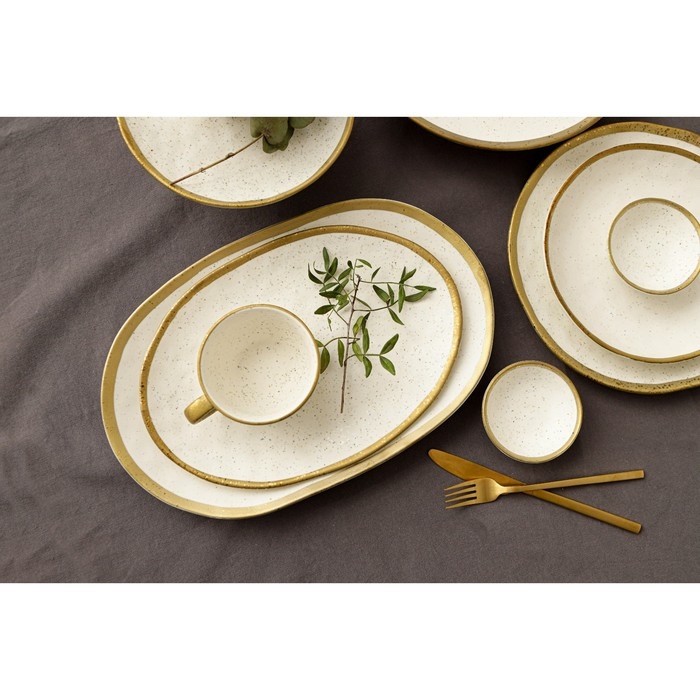 Посуда серии Magistro Poursephona — это современная фарфоровая посуда. В оформлении серии превалируют два цвета – бежевый оттенок фарфора и роскошное золото в виде широкой окантовки предметов. Идеально подходит как для формального обеда, так и для торжеств по особым случаям. Лаконичные формы, золотая окантовка, разноцветные вкрапления придают изделиям из фарфора одновременно необычный и современный вид.