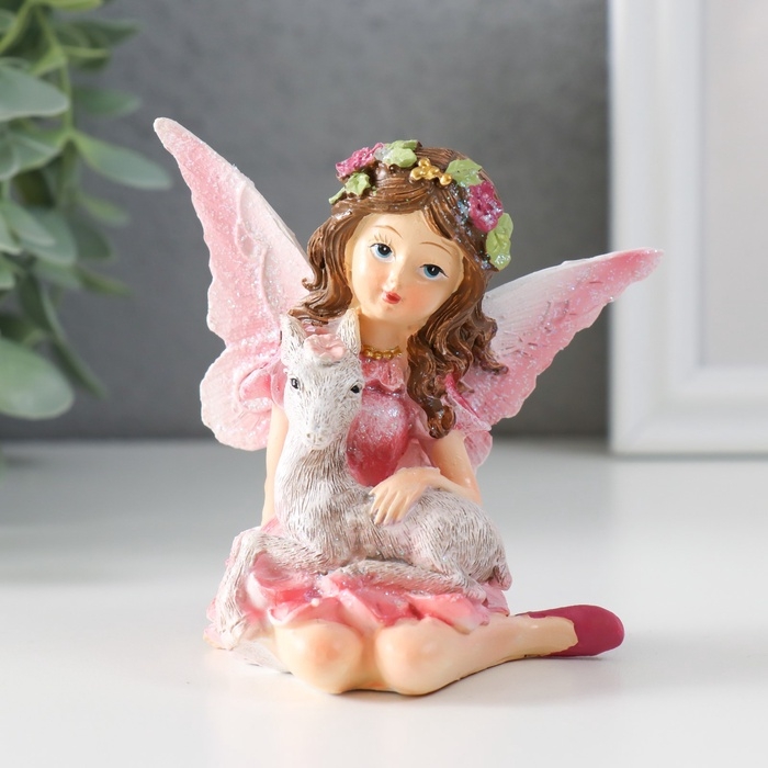 Сувенир полистоун "Девочка-бабочка с козликом" розовые крылья 8,5х6х9 см