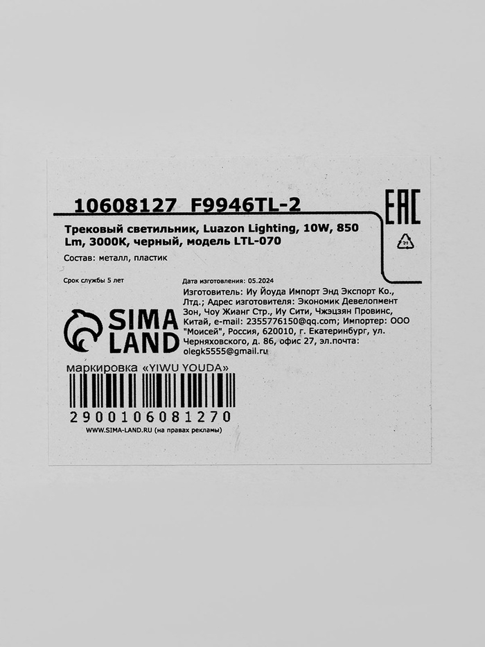 Трековый светильник, Luazon Lighting, LTL-070, 10W, 850 Lm, 3000К, черный