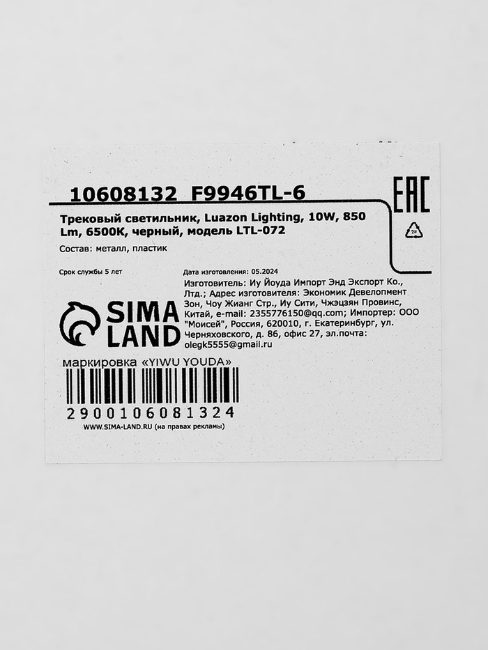 Трековый светильник, Luazon Lighting, LTL-072, 10W, 850 Lm, 6500К, черный