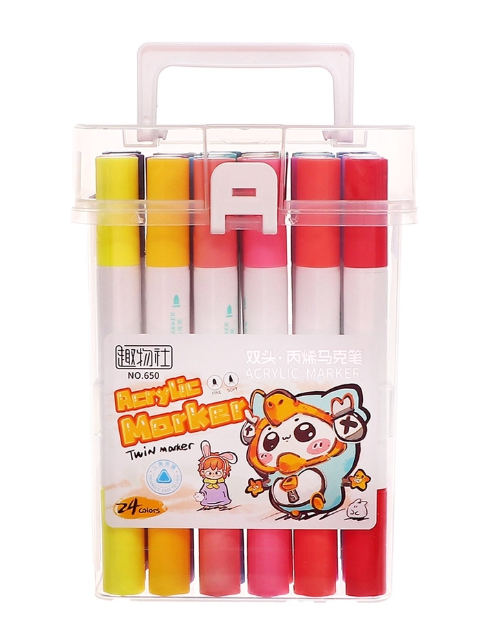 Набор акриловых маркеров 24 цвета в пластиковом кейсе, двусторонние