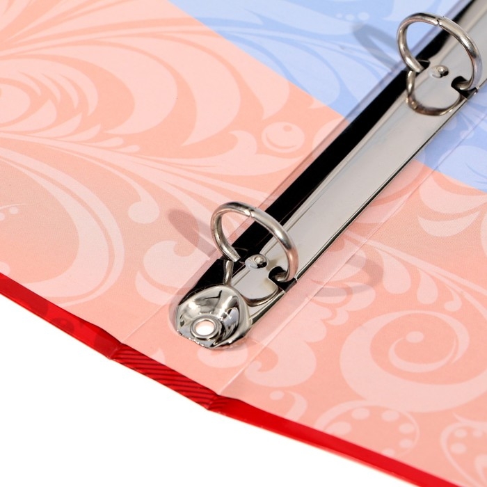 Обложка выполнена из переплетного картона плотностью 1,5 мм, внутри есть четыре кольца, на которые следует цеплять файлы.